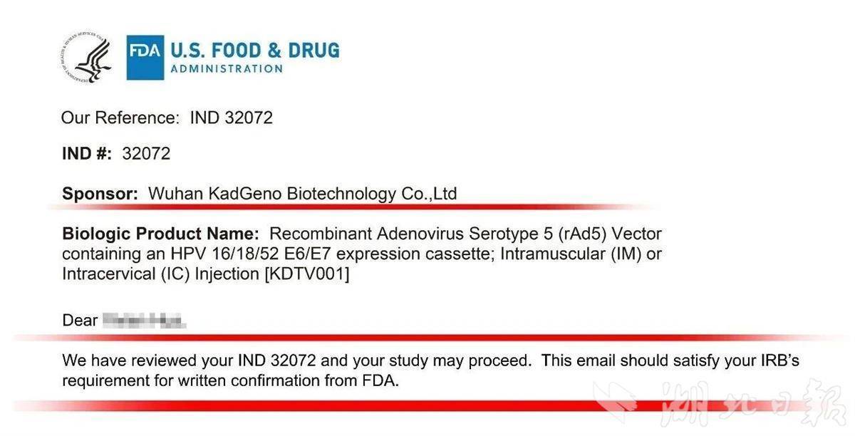 湖北日报讯(记者张真真)近日,位于光谷的武汉凯德维斯生物技术有限公司(简称“凯德维斯”)宣布,其自主研发的Ⅰ类创新药KDTV001注射液已获得美国食品药品监督管理局(FDA)新药临床试验申请许可,用于治疗人乳头瘤病毒(HPV)16/18/52型感染相关的鳞状上皮内瘤变和相关癌症,实现全球首创。